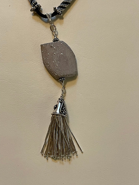 Long Peyote Stitch Beadwork Neklace with Artisanal Ceramic Bead and Sterling Silver Findings