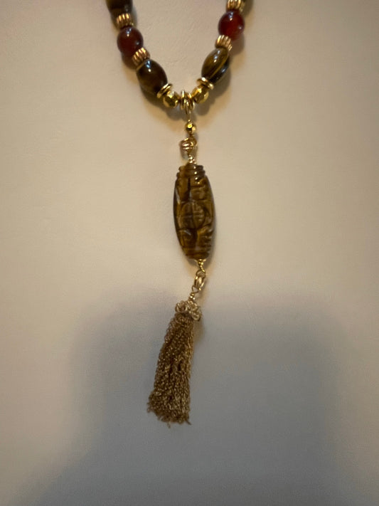 Graded Color Carnelian and Tigereye Necklace with Carved Stone and Chain Tassel