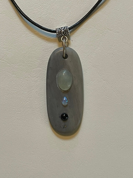 Tabular Pendant of Jade, Onyx, Opal on Handmade Leather Cord